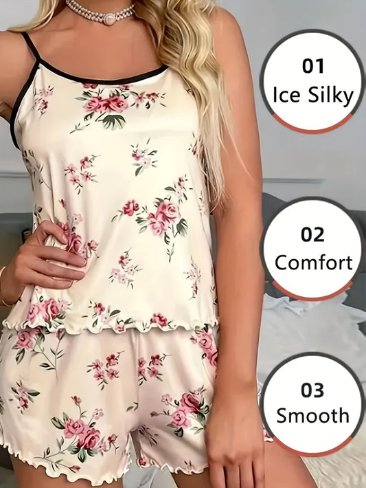 Leopard Lace Pajama Set - V-Neck Suspender Top and Elastic Waist Shorts