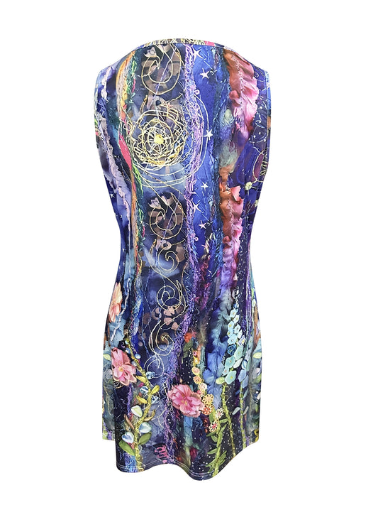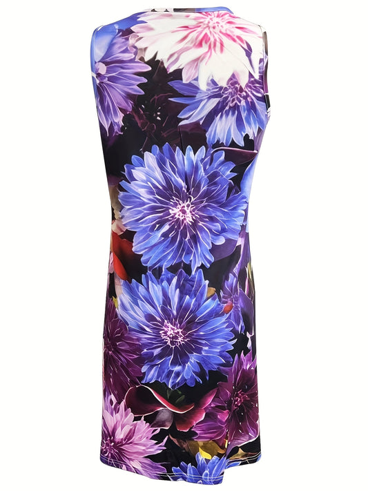 Vibrant Floral Print Crew Neck Tank Dress - Elegant Sleeveless A-Line Silhouette