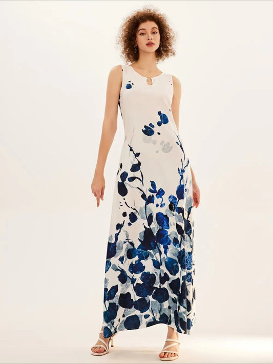 Women's Elegant Floral Print Sleeveless Maxi Dress - A-Line Silhouette, Round Neck