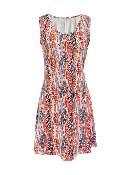 Women's Vibrant Geometric Print Sleeveless Dress - Short, Crew Neck