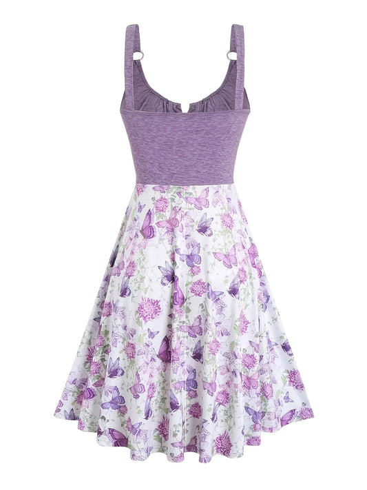 Butterfly and floral print sleeveless sundress with round neck